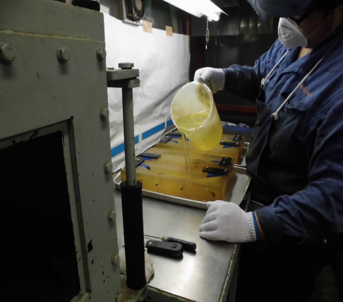 (1)はちみつ状の原液と硬化剤を混ぜ合わせ、型に注ぎます。